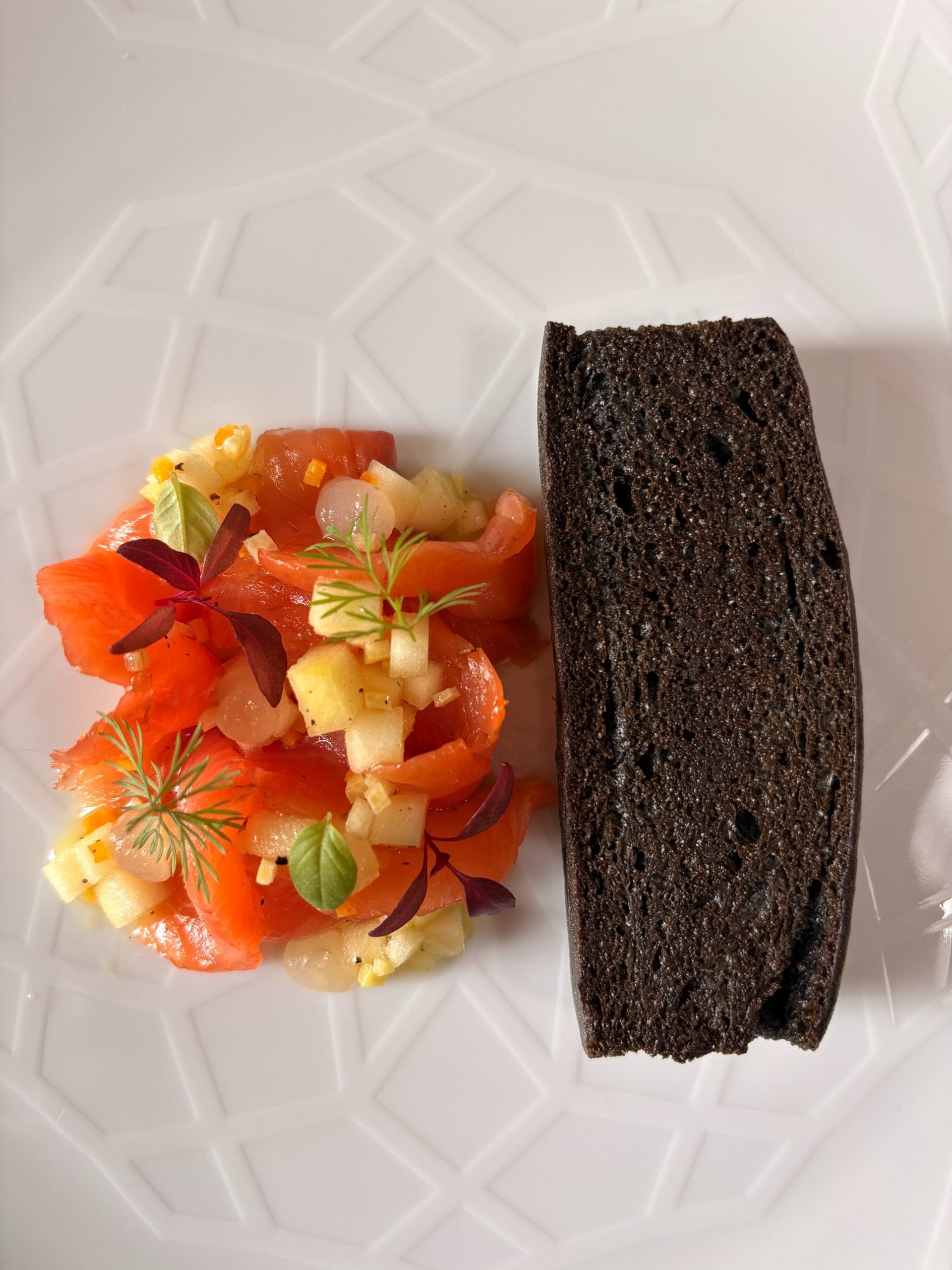 Pan brioche al carbone, trota marinata agli agrumi, gremolade di mela verde e gel al limone