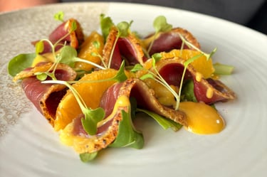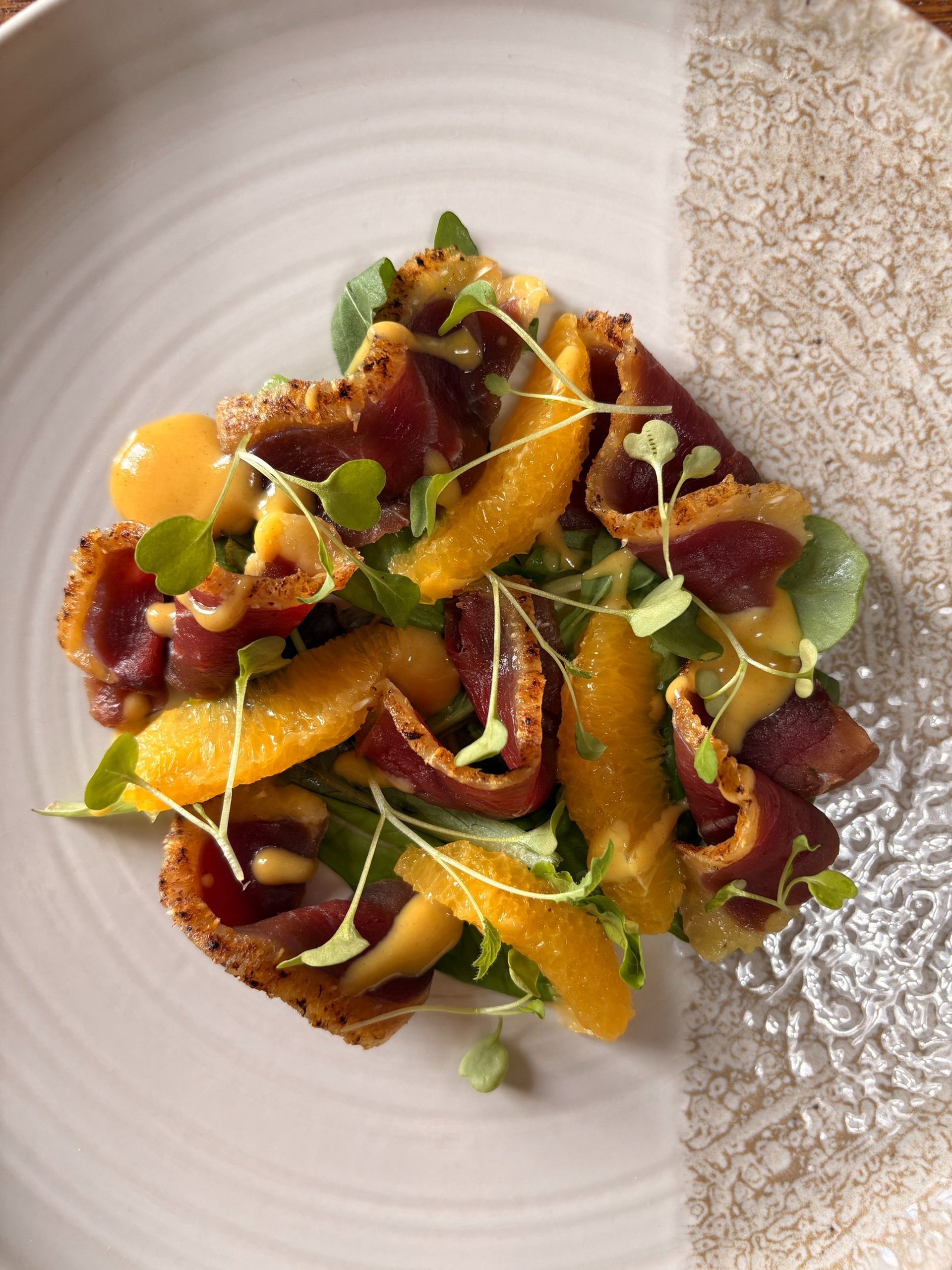 Speck di anatra, senape al miele, arancia e misticanza