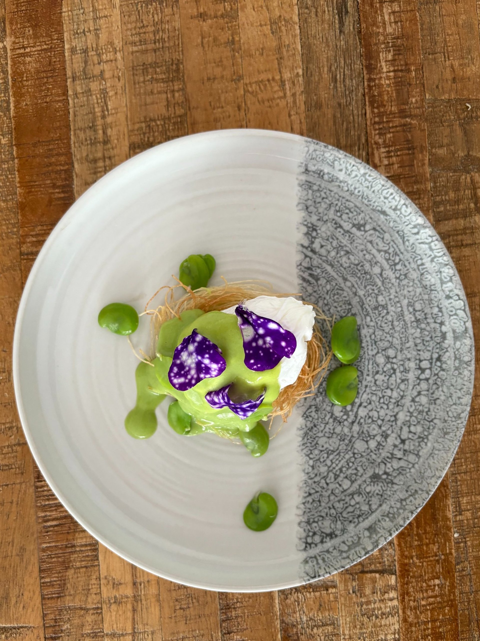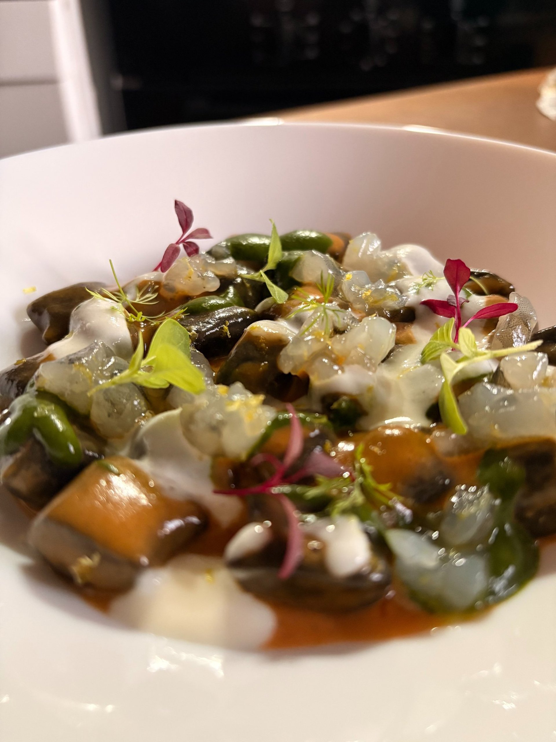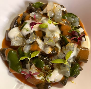Raviolo gamberi e funghi, crema di bufala e olio al prezzemolo