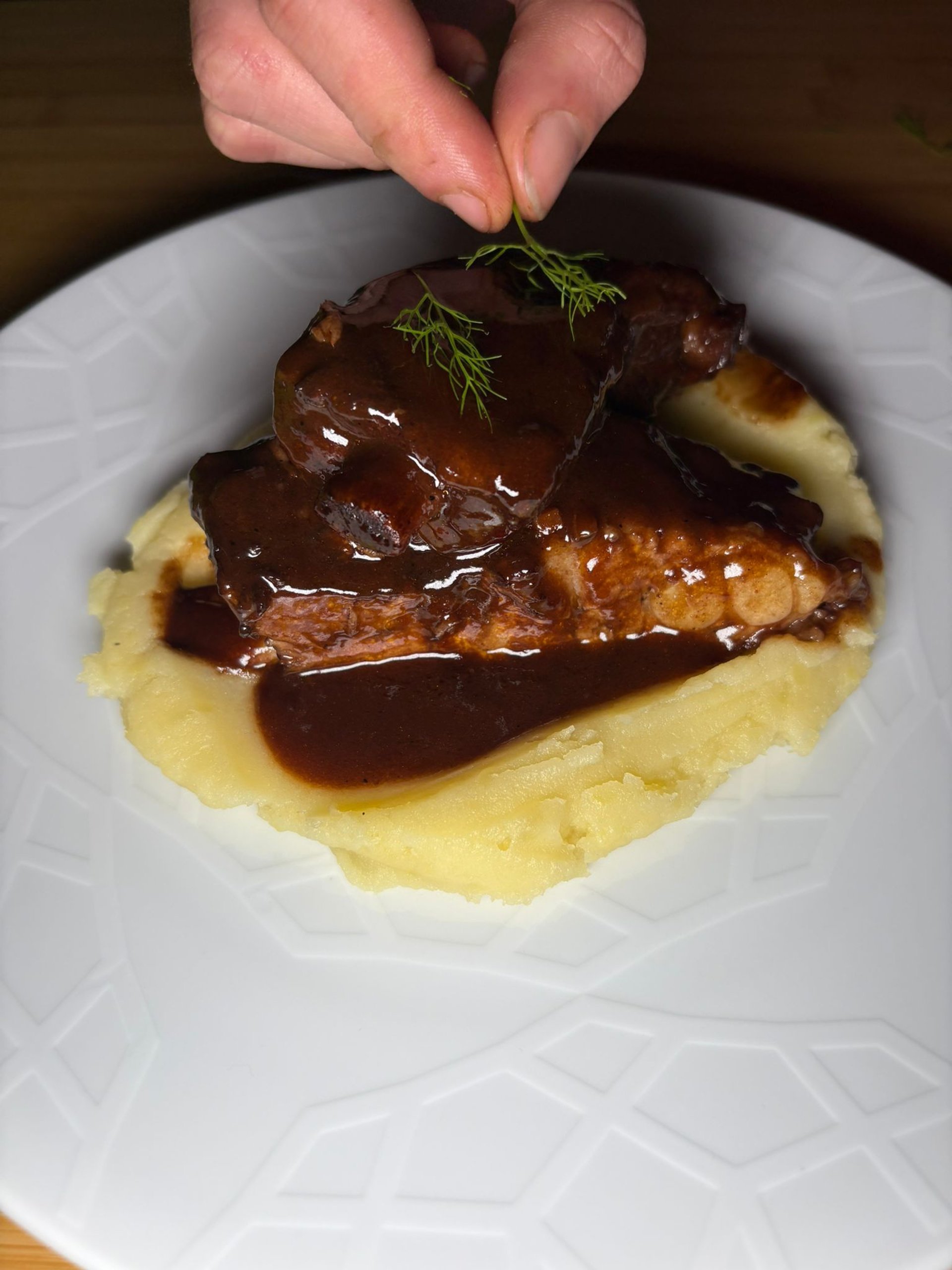 Brasato di manzo al vino rosso, cremoso di patate e cipollotto arrostito