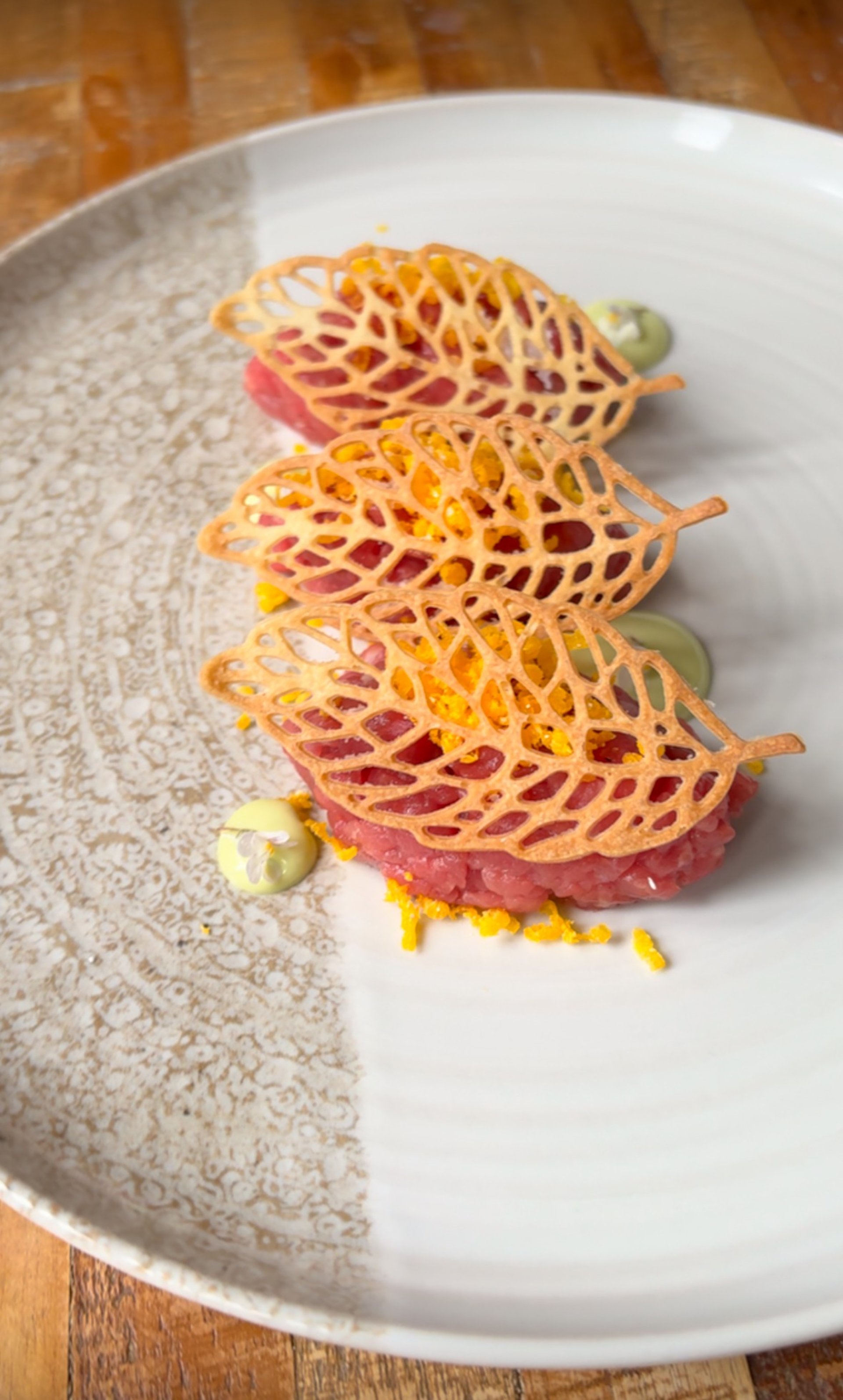 Battuta di Fassona, tuorlo marinato, mayo al tartufo, cialda croccante