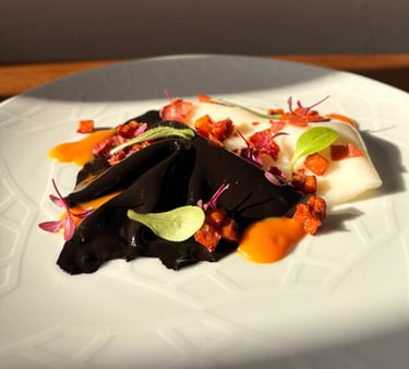 Velo di seppia bianco e nero, zucca arrostita, bacon